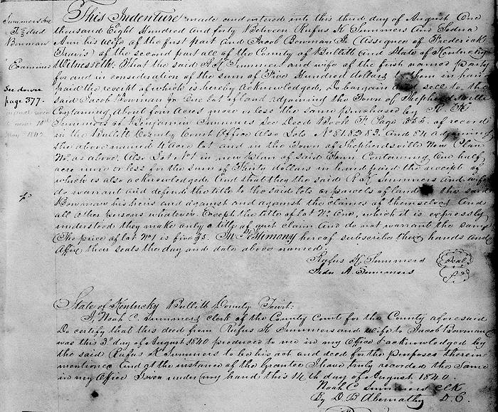 On 3 Aug 1840 Rufus K. Summers sold 5 Shepherdsville lots and a 4 acre tract adjoining the town to Jacob Bowman Jr. He had obtained Lot #1 at a tax auction, and sold it to Bowman as a quit claim without a title warranty. The other 4 lots (81, 82, 83 and 84) had been purchased by Summers from the town trustees in 1828.