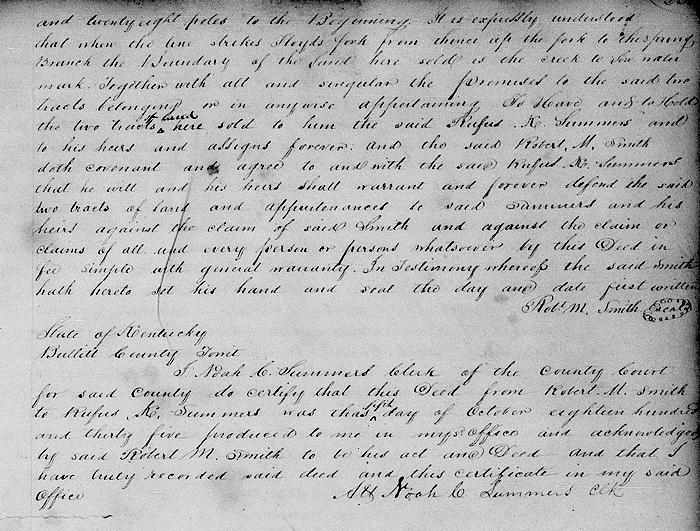 This indenture made and entered into this first day of October 1835 between Robert M. Smith of Bullitt County and state of Kentucky of the one part and Rufus K. Summers of the same place of the other part.