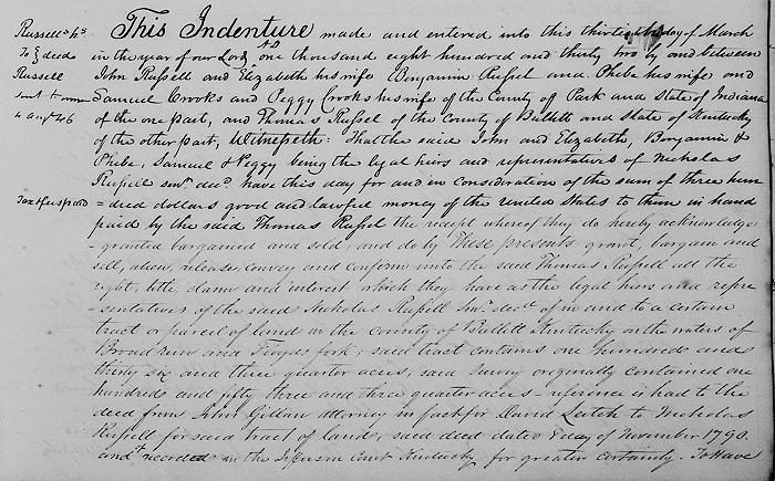 This indenture made and entered into this thirteenth day of March in the year of our Lord one thousand eight hundred and thirty two by and between John Russell and Elizabeth his wife, Benjamin Russell and Phebe his wife, and Samuel Crooks and Peggy Crooks his wife of the county of Park, State of Indiana of the one part and Thomas Russell of the County of Bullitt and State of Kentucky of the other part.