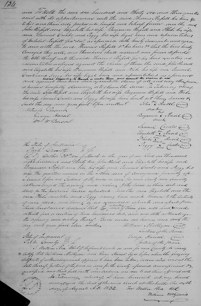 In testimony whereof the said John Russell and Elizabeth, his wife, Benjamin Russell and Phebe his wife, Samuel Crooks and Peggy, his wife have hereto set their hands and seals the day and year first before written.