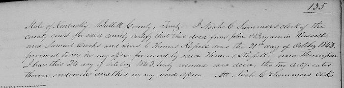 Witnesseth: That the said John and Elizabeth, Benjamin and Phebe, Samuel and Peggy being the legal heirs and representatives of Nicholas Russell, Sr. dec’d, have this day for and in consideration of the sum of three hundred dollars good and lawful money of the United States to them in hand paid by the said Thomas Russell, the receipt whereof they do hereby acknowledge, granted, bargained and sold, and do by these presents grant, bargain and sell, alien, release, convey and confirm unto the said Thomas Russell all the right, title, claim and interest which they have as the legal heirs and representatives of the said Nicholas Russell Sr. dec'd, of in and to a certain tract or parcel of land in the County of Bullitt, Kentucky, on the waters of Broad Run and Floyd's Fork, said tract contains one hundred and thirty six and three quarters acres, said survey originally contained one hundred and fifty three and three quarter acres, reference is had to the deed from John Gillan, attorney in fact for Davie Leitch to Nicholas Russell for said tract of land, said deed dated 8th day of November 1790, and recorded in the Jefferson Court, Kentucky for greater certainty
