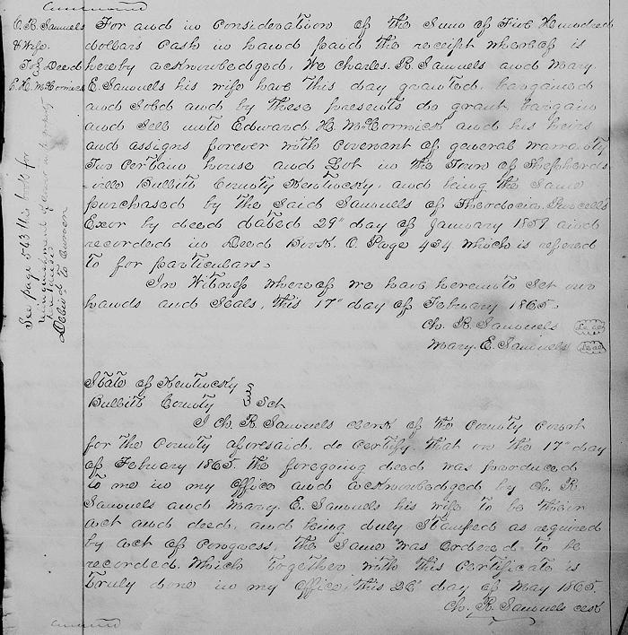 For and in consideration of the sum of $500 cash in hand paid, the receipt whereof is hereby acknowledged, we Charles R. Samuels and Mary E. Samuels his wife have this day granted, bargained and sold, and by these presents do grant, bargain and sell unto Edward H. McCormick and his heirs and assigns forever with covenant of general warranty two certain house and lot in the town of Shepherdsville, Bullitt County, Kentucky, and being the same purchased by the said Samuels of Theodocia Purcell's executor by deed dated 29th day of January 1859 and recorded in Deed Book O, page 434 which is referred to for particulars.