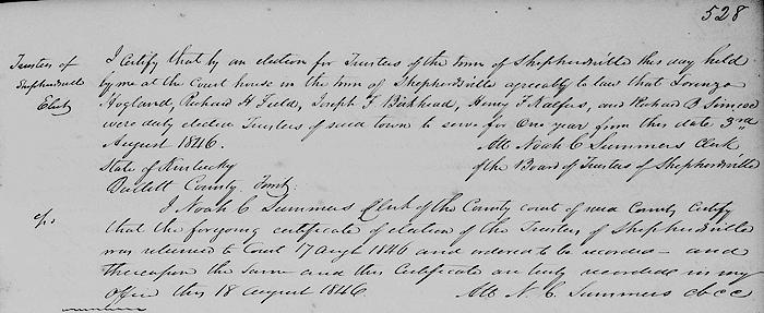 I Noah C. Summers, clerk of the county court of said county, certify that the foregoing certificate of election of the trustees of Shepherdsville was returned to court 17 August 1846 and ordered to be recorded, and thereupon the same and this certificate are truly recorded in my office this 18 August 1846. Att. N. C. Summers, C.B.C.C.