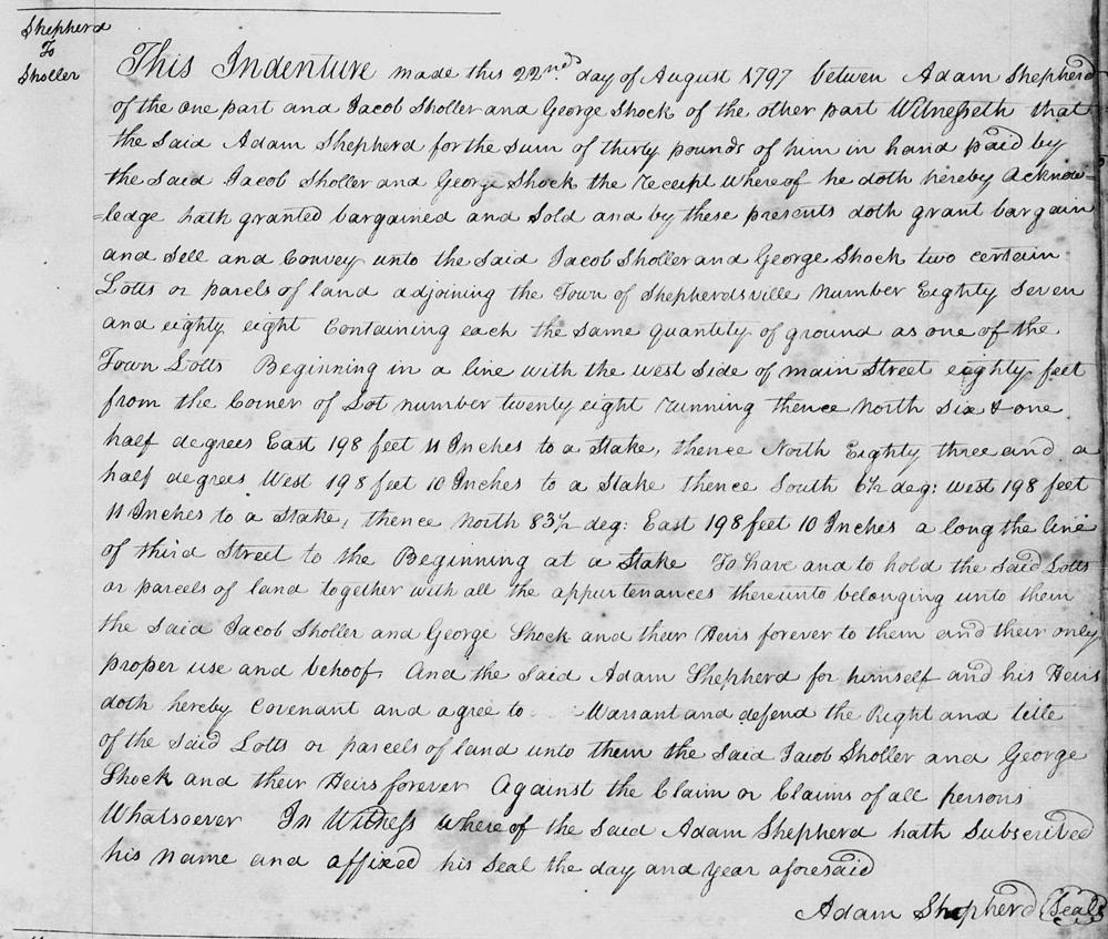 Witnesseth that the said Adam Shepherd for the sum of thirty pounds of him in hand paid by the said Jacob Sholler and George Shock, the receipt whereof he doth hereby acknowledge, hath granted, bargained and sold, and by these presents doth grant, bargain and sell and convey unto the said Jacob Sholler and George Shock two certain lots or parcels of land adjoining the town of Shepherdsville, number 87 and 88 containing each the same quantity of ground as one of the town lots.