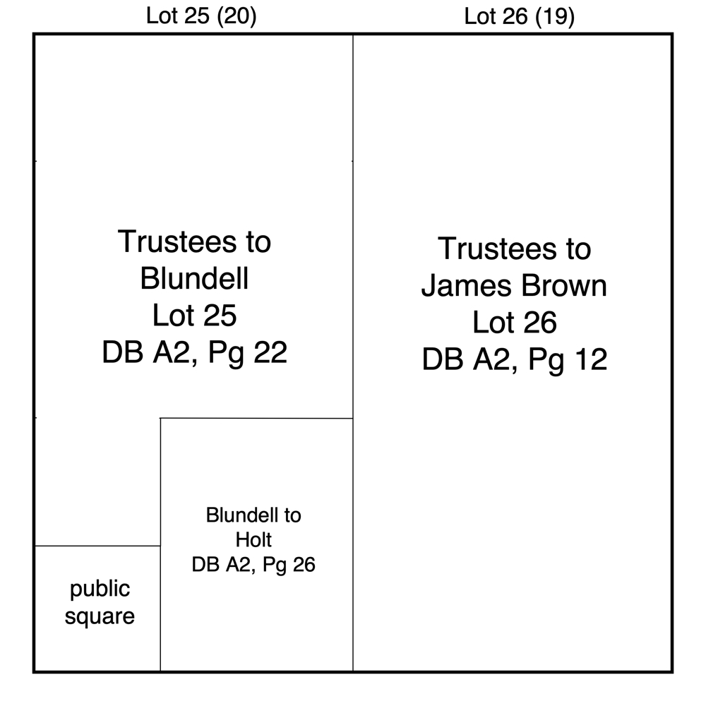 Blundell sold the lot in several parts, selling the southeastern part, measuring approximately 60 x 80 feet, to Thomas Holt in July, as shown here. Then in November he sold Holt a 40 x 40 foot section located north of the part dedicated to the public square.