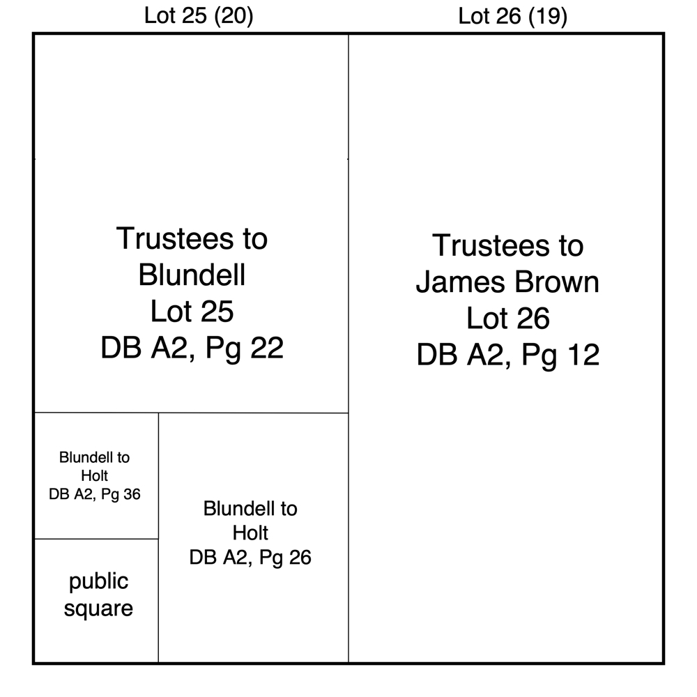 Blundell sold the lot in several parts, selling the southeastern part, measuring approximately 60 x 80 feet, to Thomas Holt in July. Then in November he sold Holt a 40 x 40 foot section located north of the part dedicated to the public square, as shown here. This deed was recorded twice; once in Book A1 on pages 10-11, and a second time in Book A2 on pages 36-37.
