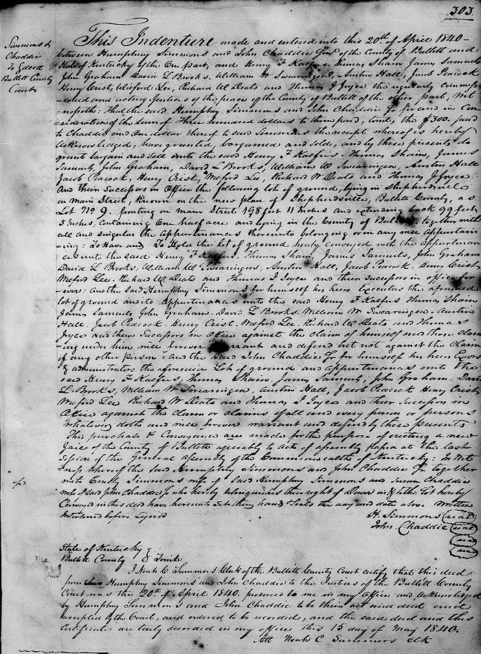 Witnesseth that the said Humphrey Simmons and John Chaddic Sr. for an in consideration of the sum of $300 to them paid, to wit, the $300 paid to Chaddic and one dollar thereof to said Simmons, the receipt whereof is hereby acknowledged, have granted, bargained and sold, and by these presents do grant, bargain, and sell unto the said Henry F. Kalfus, Thomas Shain, James Samuels, John Graham, David L. Brooks, William W. Swearingen, Austin Hall, Jacob Peacock, Henry Crist, Wilford Lee, Richard W. Deats and Thomas J. Joyce and their successors in office the following lot of ground lying in Shepherdsville on Main Street, known on the new plan of Shepherdsville, Bullitt County as Lot No. 9, fronting on Main Street 198'11" and extending back 99'5", containing one-half acre, and lying in the county of Bullitt, together with all and singular the appurtenances thereunto belonging or in any wise appertaining.