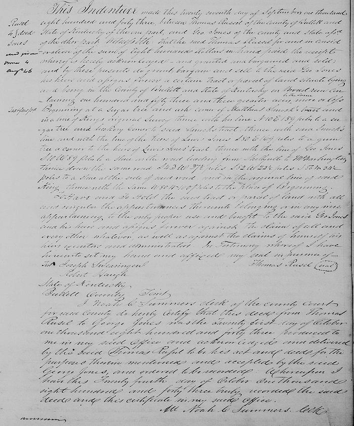 This indenture made this 27th day of September 1843 between Thomas Russell of the county of Bullitt and state of Kentucky of the one part, and George Jones of the county and state aforesaid of the other part.