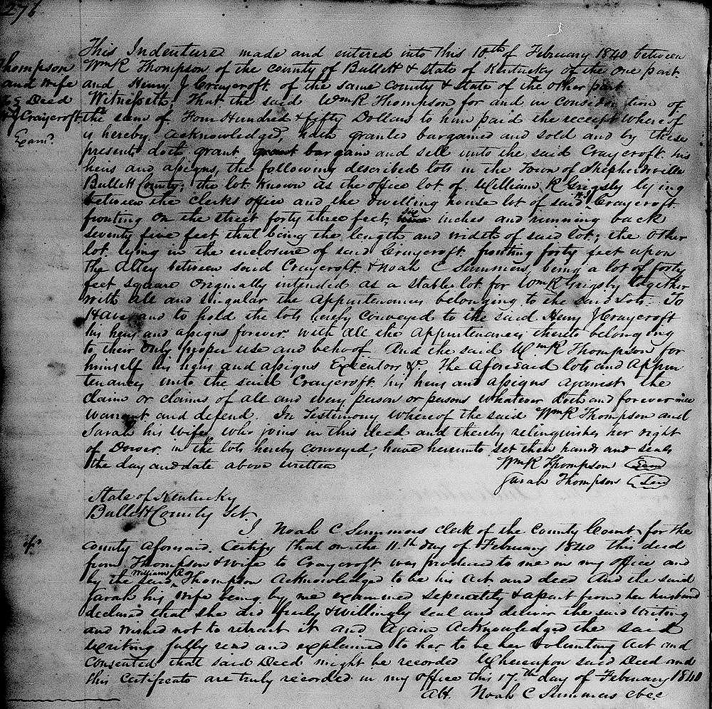 This indenture made and entered into this 10th of February 1840 between William R. Thompson, of the county of Bullitt and state of Kentucky of the one part and Henry J. Craycroft of the same county and state of the other part.