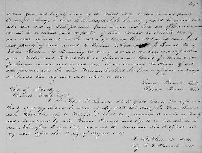 Witnesseth that the said Thomas Russell and Rhoda his wife for and in consideration of the sum of $350 good and lawful money of the United States to them in hand paid, the receipt whereof is hereby acknowledged, hath this day granted, bargained and sold, and doth by these presents grant, bargain and sell all of their undivided interest in a certain tract or parcel of land situated in Bullitt County and state aforesaid on the waters of Broad Run, it being the same tract and parcel of land deeded to William C. Short and Thomas Russell Jr. by Thomas Russell Sr., containing by survey 6 1/2 and a fraction acres.