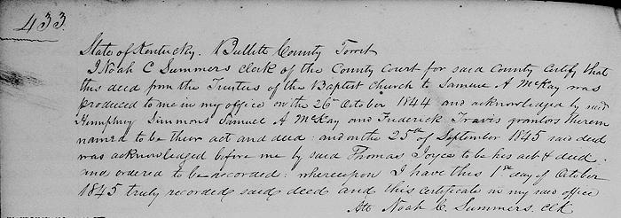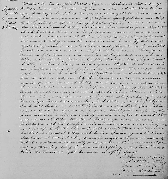 Whereas the trustees of the Baptist Church in Shepherdsville, Bullitt County, Kentucky purchased a lot number 43 in said town with other lots for the purpose of building a church house thereon, and not being able then to do so, said trustees applied and procured an act of the general assembly of the Commonwealth of Kentucky, passed and approved February 13, 1841, authorizing Humphrey Simmons, Thomas Joyce, Samuel A. McKay and Frederick Travis, trustees of said Baptist Church to sell and convey said lots for purposes named and said act and said trustees did sell said lot No. 43 in the new plan of the town of Shepherdsville to Samuel A. McKay for about the sum of $150 and applied the proceeds of sale to the payment of the debt due by said trustees for said lots so named in the act of assembly as aforesaid.