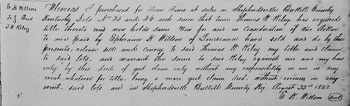 Whereas I purchased for town taxes at sales in Shepherdsville, Bullitt County, Kentucky, lots Nos. 35 and 36, and since that time Thomas W. Riley has acquired title thereto, and now holds same; now for and in consideration of one dollar to me paid by Ephraim K. Willson of Louisiana, have sold and do by these presents release, sell and convey to said Thomas W. Riley my title and claim to said lots, and warrant the same to said Riley against me and my heirs only by this deed of quit claim only without any responsibility on me in any event whatever for title, being a mere quit claim deed without recourse in any event. Said lots are in Shepherdsville, Bullitt County, Kentucky; August 22nd 1842. (signed) E. K. Willson