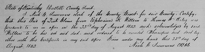 On 29 Jan 1839, John J. Thomasson and Noah C. Summers sold Shepherdsville lots 35-36 to Thomas W. Riley. Ephraim K. Willson also held a claim to these lots which he released to Riley by quit claim in 1842, as shown below.