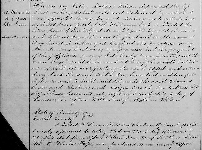 Following a court decree, part of Shepherdville town lot No. 58 and house, and a ten acre tract belonging to John H. Baker were sold at auction to Matthew Wilson. Following Wilson's death, his son and executor Upton Wilson sold the part of Lot No. 58 to Thomas Joyce as shown below.