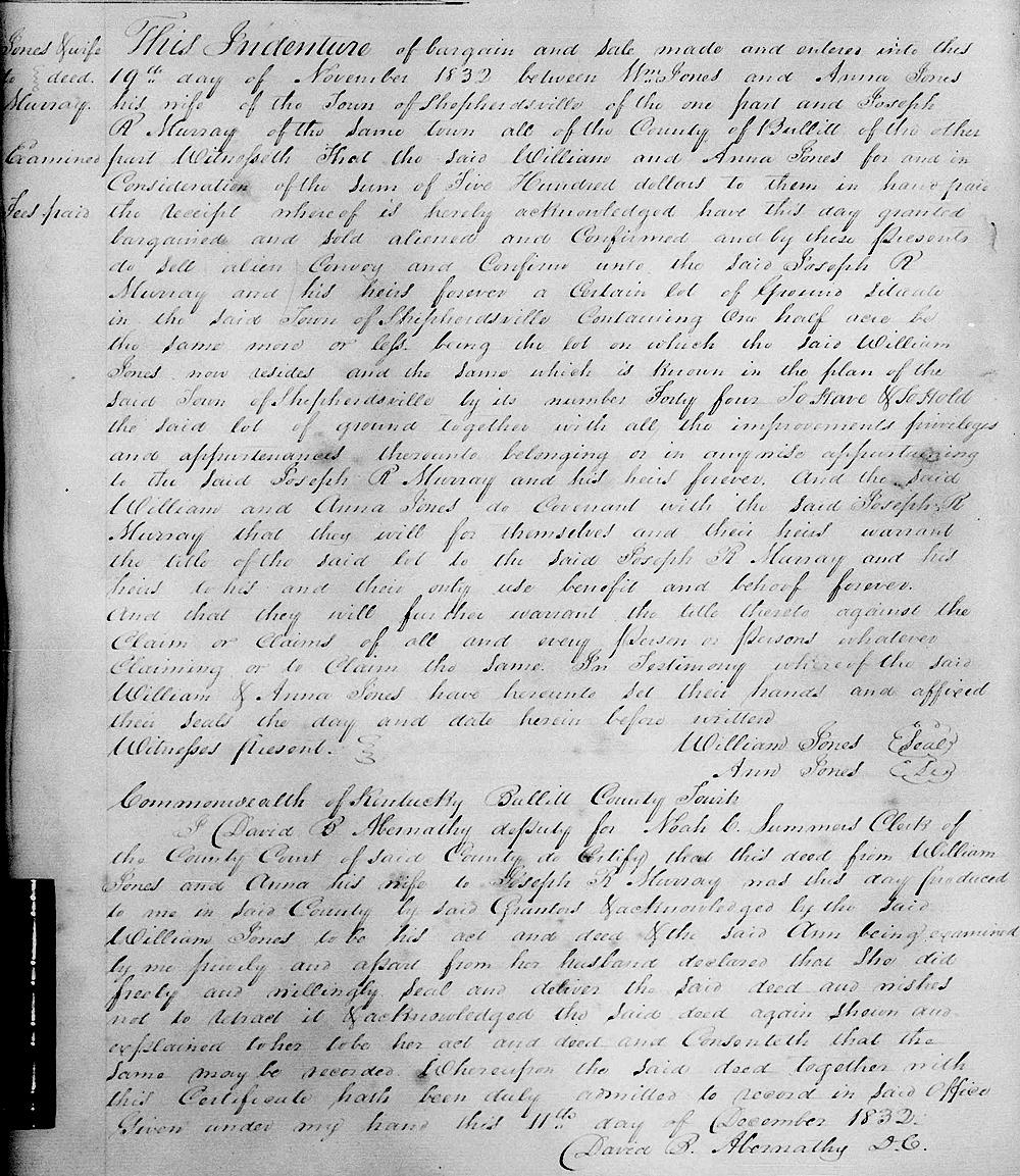 This indenture of bargain and sale made and entered into this 19th day of November 1832 between William Jones and Anna Jones his wife of the town of Shepherdsville of the one part and Joseph R. Murray of the same town, all of the county of Bullitt, the other part.