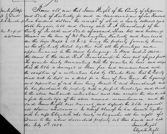 Know all men that James Wright of the County of Jefferson and State of Kentucky for and in consideration of $2,500, the receipt of which is hereby acknowledged, doth bargain, sell and convey unto R. A. Beauchamp of the County of Bullitt and State aforesaid three lots and buildings thereon in the town of Mt. Washington, Kentucky, and numbered on the town map 6, 10 & 14, being the property formerly known as the Kentucky Hotel, together with all the privileges and appurtenances to the same belonging.