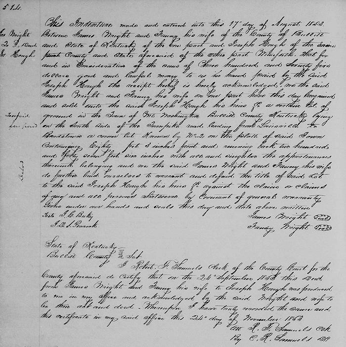 Witnesseth that for and in consideration of the sum of $375 good and lawful money to us in hand paid by the said Joseph Hough, the receipt hereof is hereby acknowledged, we the said James Wright and Fanny his wife on our part have this day bargained and sold unto the said Joseph Hough, his heirs &c a certain lot of ground in the town of Mt. Washington, Bullitt County, Kentucky lying on the south side of the turnpike road leading from Louisville to Bardstown, a corner lot known by No. 2 on the plat of said town containing 80'3" front and running back 247'6" with all and singular the appurtenances thereunto belonging, and we the said James Wright and Fanny his wife do further bind ourselves to warrant and defend the title of said lot to the said Joseph Hough, his heirs &c against the claim or claims of any and all persons whatsoever by covenant of general warranty. Given under our hands and seals this day and date above written. (signed by grantors)