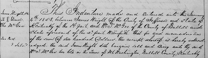 This indenture made and entered into this January 4, 1858 between James Wright of the county of Jefferson and state of Kentucky of the first part and William T. McGee of the county of Bullitt and state aforesaid of the second part.