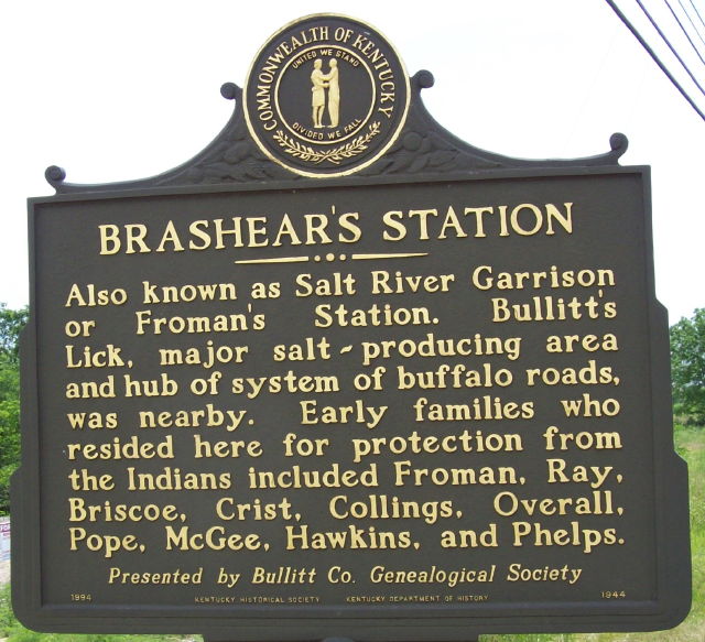 (Reverse) Brashear's Station - Also known as Salt River Garrison or Froman's Station. Bullitt's Lick, major salt-producing area and hub of system of buffalo roads, was nearby. Early families who resided here for protection from the Indians included Froman, Ray, Briscoe, Crist, Collings, Overall, Pope, McGee, Hawkins, and Phelps. Presented by Bullitt Co. Genealogical Society.