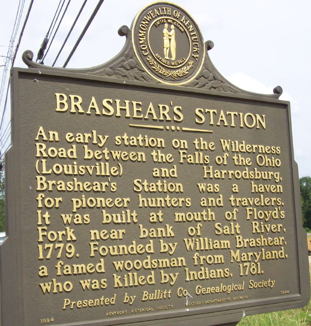 Description: An early station on the Wilderness Road between the Falls of the Ohio (Louisville) and Harrodsburg, Brashear's Station was a haven for pioneer hunters and travelers. It was built at mouth of Floyd's Fork near bank of Salt River, 1779. Founded by William Brashear, a famed woodsman from Maryland, who was killed by Indians, 1781. Presented by Bullitt Co. Genealogical Society.