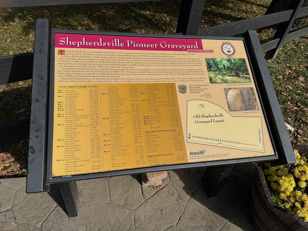 This marker is located at the entrance to the Shepherdsville Pioneer Graveyard, beside the City Park. While the cemetery is well-maintained, this marker is in need of repairs.