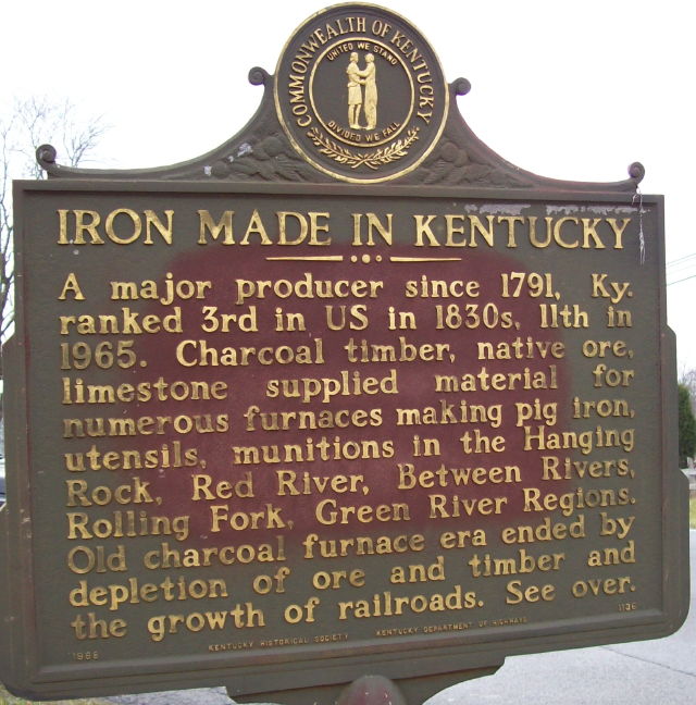 (Reverse) Iron Made in Kentucky - A major producer since 1791, Ky. ranked 3rd in US in 1830s, 11th in 1965. Charcoal timber, native ore, limestone supplied material for numerous furnaces making pig iron, utensils, munitions in the Hanging Rock, Red River, Between Rivers, Rolling Fork, Green River Regions. Old charcoal furnace era ended by depletion of ore and timber and the growth of railroads. See over.