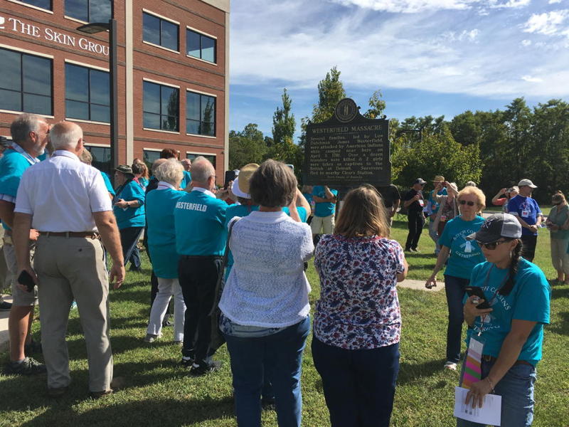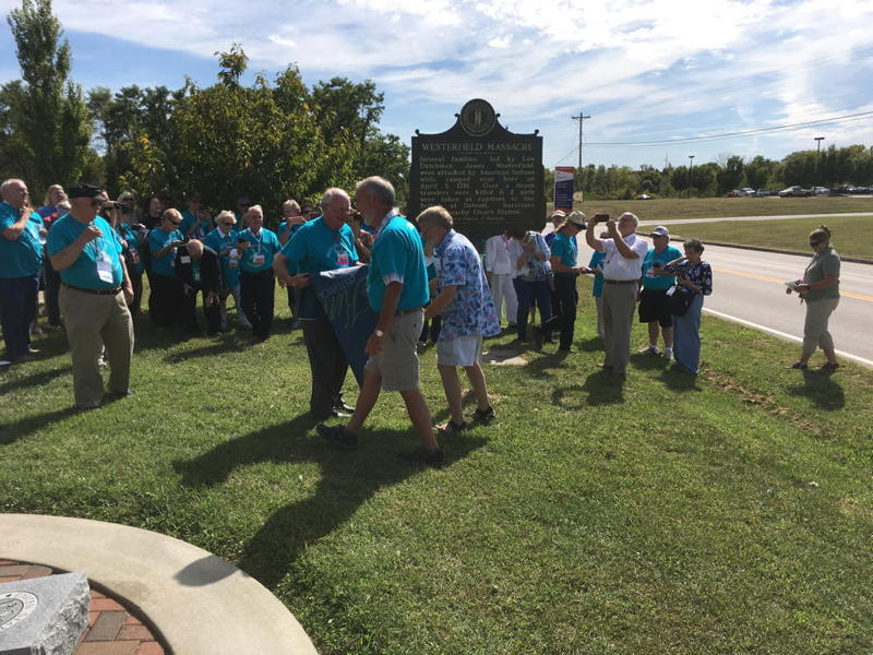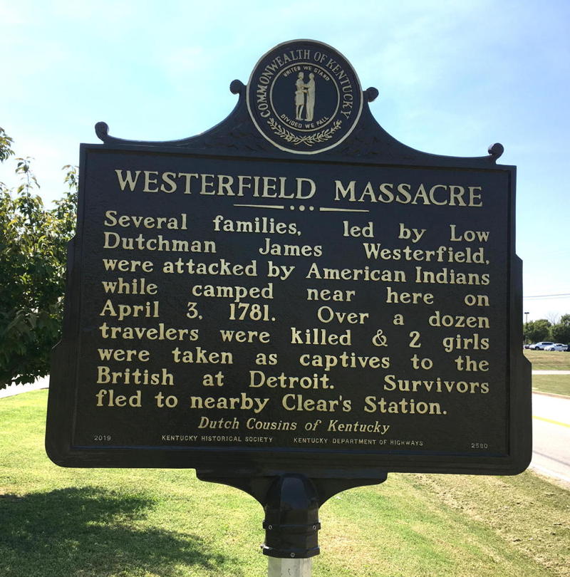 Description: Several families, led by Low Dutchman James Westerfield, were attacked by American Indians while camped near here on April 3, 1781. Over a dozen travelers were killed & 2 girls were taken as captives to the British in Detroit. Survivors fled to nearby Clear's Station. Presented by Dutch Cousins of Kentucky.