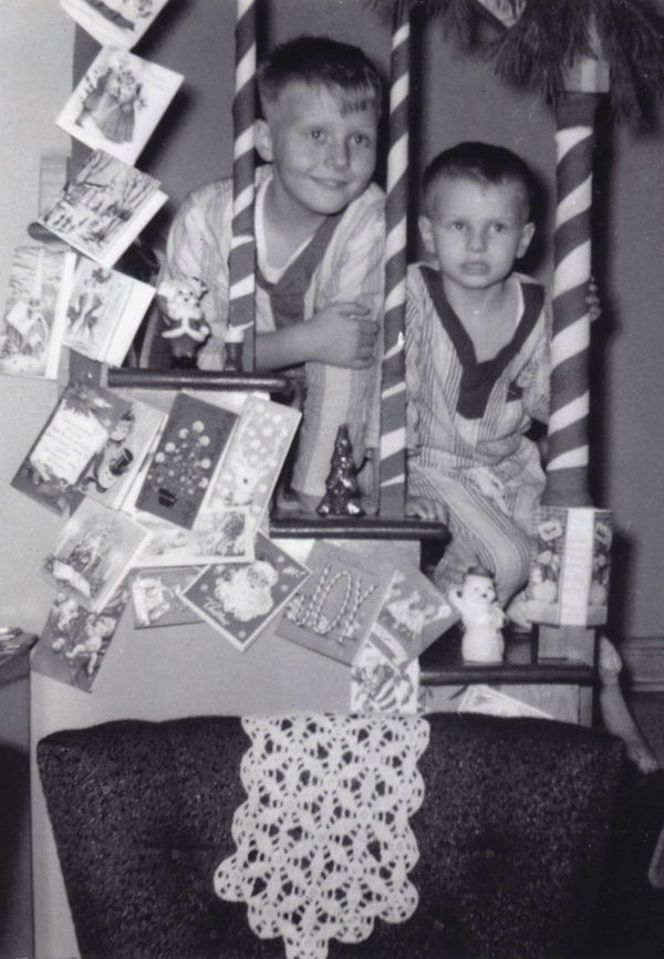 One of my favorite photos from my own youth is one of my older brother, Dale, and I sitting on the steps on Christmas morning, peering through the staircase spindles. The spindles were wrapped in red crepe paper in an attempt to look like candy canes; the railing wrapped in fresh-smelling pine brought from the woods. Colorful Christmas cards were taped on the wall; festive little holiday candles sat, tempting me to play with them.