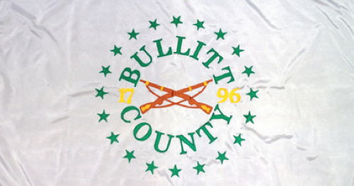 Bullitt County's flag represents the early history of Bullitt County. This flag was adopted as the official flag of Bullitt County on September 18, 1967. The design was first displayed on December 13 of that year at a ceremony at Roby Elementary School, marking the 171st anniversary of the county. The white background represents salt, which was an important factor in Bullitt County history. The first commercial salt works west of the Allegheny Mountains was erected at Bullitt's Lick. Salt, though often maligned today, is a requirement for life. Bullitt County's salt works made pioneer settlement in the region infinitely more possible. The green color in the flag represents the beautiful land, which was and is lush and bountiful. The circle of 20 stars represents Bullitt County's rank as the 20th county created in the state (Similar to the 19 stars in Indiana's flag, marking it as the 19th state in the Union). Today there are 120 Kentucky counties. The golden "1796" represents the year Bullitt County was created by the Kentucky Legislature, December 13, 1796. The crossed muskets represent the pioneer days of the county in which battles were fought to gain and hold the land, and to survive in the wilderness.