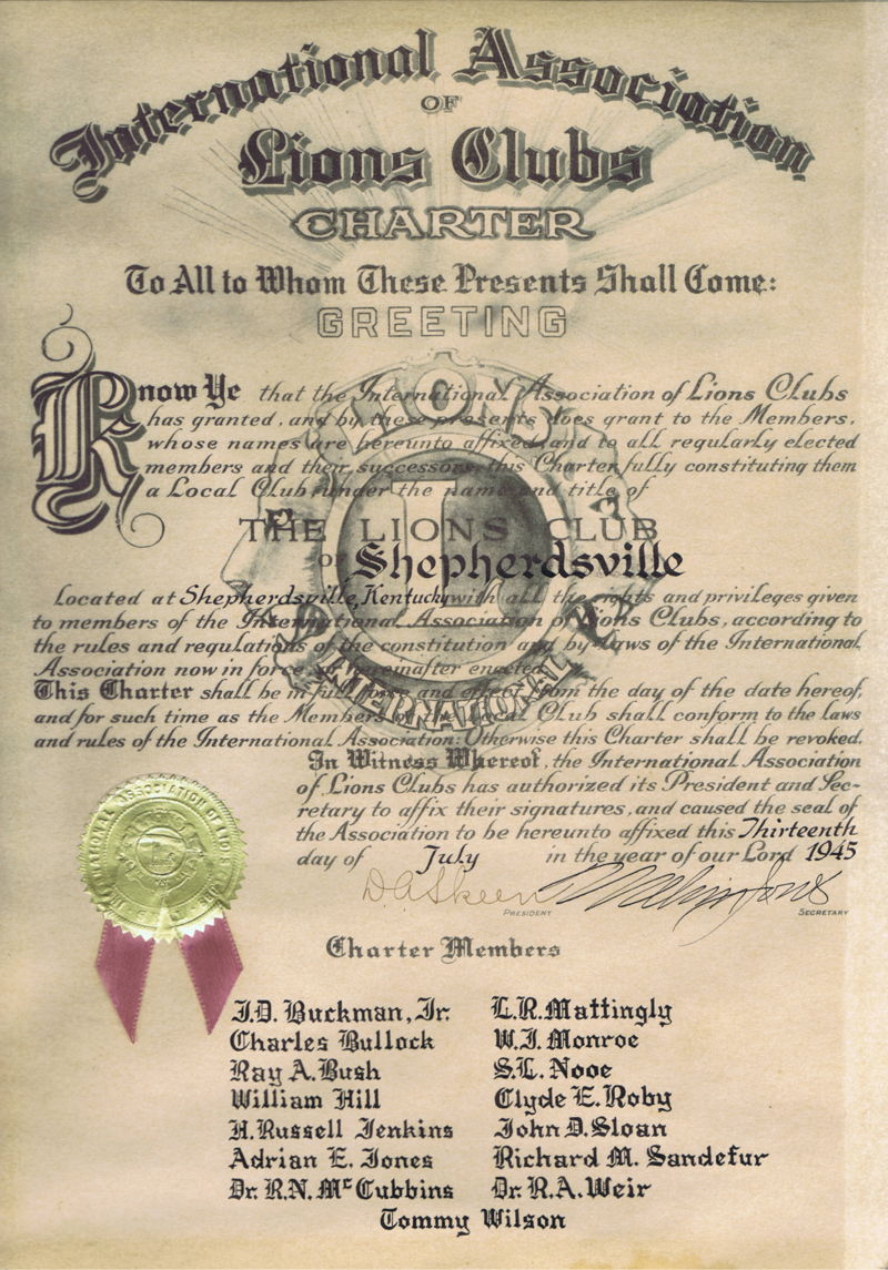 The Lions Club of Shepherdsville was chartered the month after the LJ Lions, on July 13, 1945. So this year marks the 70th anniversary of this longest-running Bullitt County Lions club. Charter members of the club were J.D. Buckman, Jr., Charles Bullock, Ray A. Bush, William Hill, H. Russell Jenkins, Adrian E. Jones, Dr. R.N. McCubbins, L.R. Mattingly, W.J. Monroe, S.L. Noe, Clyde E. Roby, John D. Sloan, Richard M. Sandefur, Dr. R.A. Weir, and Tommy Wilson, as shown below on their charter.