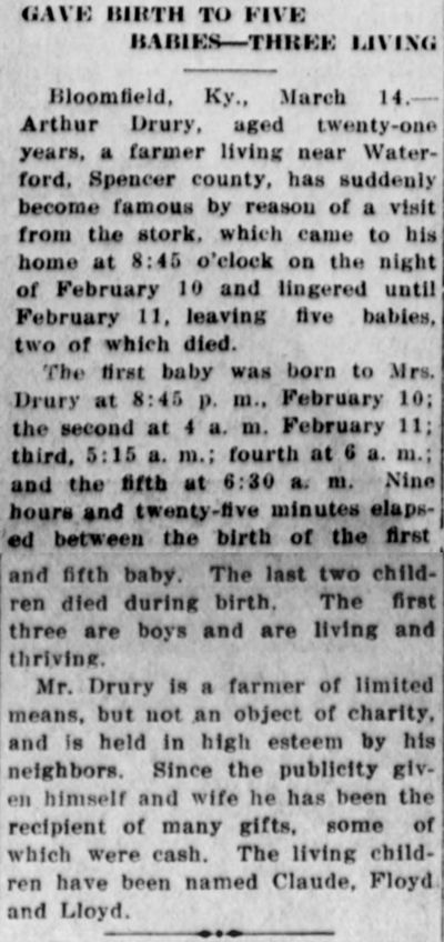 But there were more to come. After nine hours of delivery, five new babies had been born into the Drury household. The first three, boys Floyd, Lloyd, and Claude, were born alive, averaging 5 ΒΌ pounds. Two girls were stillborn. Of the three boys, Floyd (who was named after the doctor) died only two years later of whooping cough. But Lloyd and Claude lived well into their seventies (Lloyd died June 1990; Claude July, 1991).