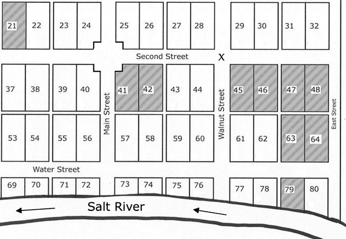 While Walnut Street ends at Joe B. Hall Avenue today, originally it extended southward toward the river, and the two lots we seek lay to the east of that extended street.